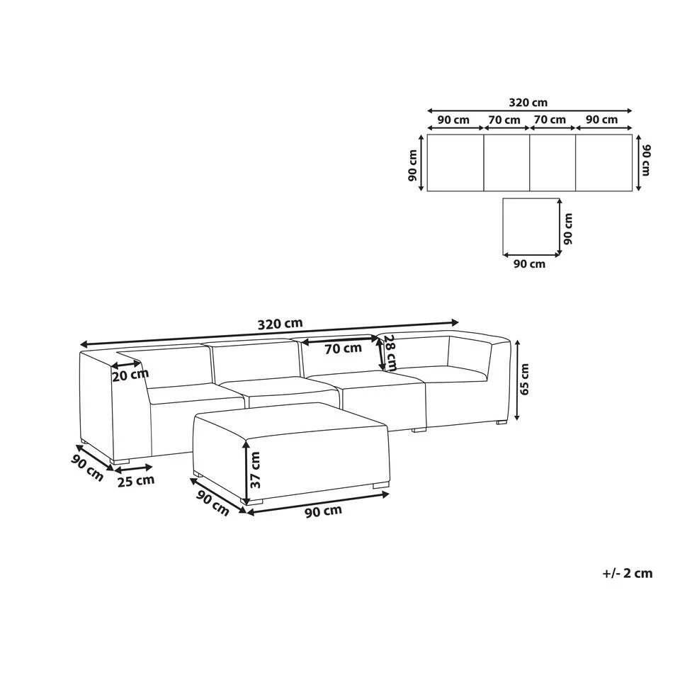 Tuin banken set met ottomaan. Modern design, comfort en functionaliteit – het omschrijft deze tuinbankset perfect. De set is bekleed met weer- en UV-bestendige stof en heeft een sneldrogende schuimvulling, waardoor hij ideaal is voor buiten. De diepe zitting zorgt voor een ongelooflijk zitcomfort, terwijl het aluminium frame stabiliteit garandeert. Deze loungeset voor buiten staat prachtig in elke tuin, maar zal ook goed staan in een woonkamer. Je kunt elk onderdeel van de set afzonderlijk of samen in je favoriete combinatie plaatsen en de poef gebruiken als voetensteun of tafel.