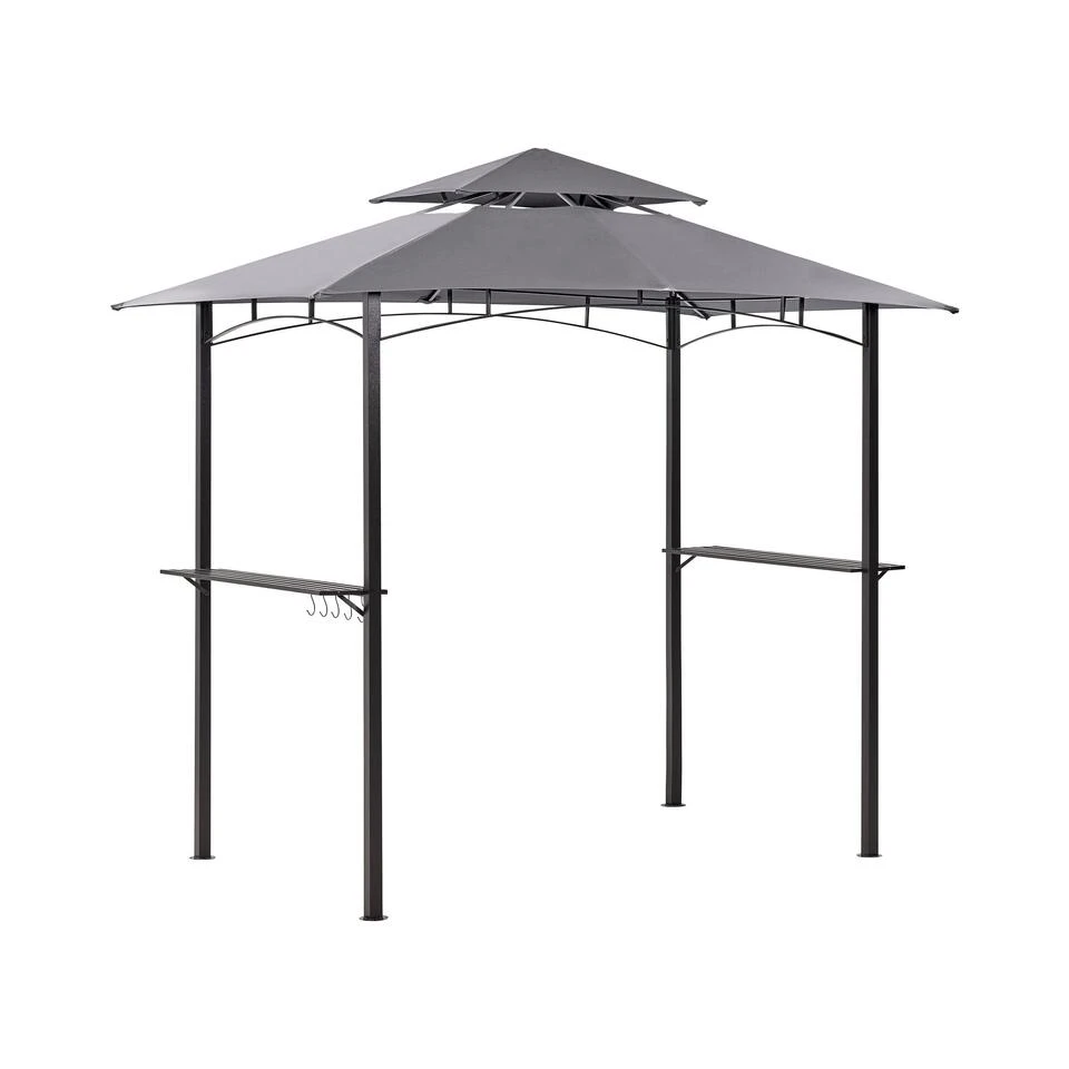 Moderne tuin prieel met planken. Maak je tuin klaar voor het barbecueseizoen en warme zomeravonden met vrienden en familie met dit tuinpaviljoen. Je kan er gemakkelijk een kleine tuinset of loungeset in kwijt. Het paviljoen is gemaakt van duurzaam gepoedercoat staal waardoor het een stabiele structuur heeft. De overkapping is gemaakt van een materiaal dat goed beschermt tegen Uv-stralen. Daarnaast heeft het een opening in het dak waardoor je altijd luchtcirculatie hebt. Het paviljoen heeft metalen planken en haken die je zullen helpen om je accessoires of bloempotten tentoon te stellen waardoor het geheel nog stijlvoller wordt.