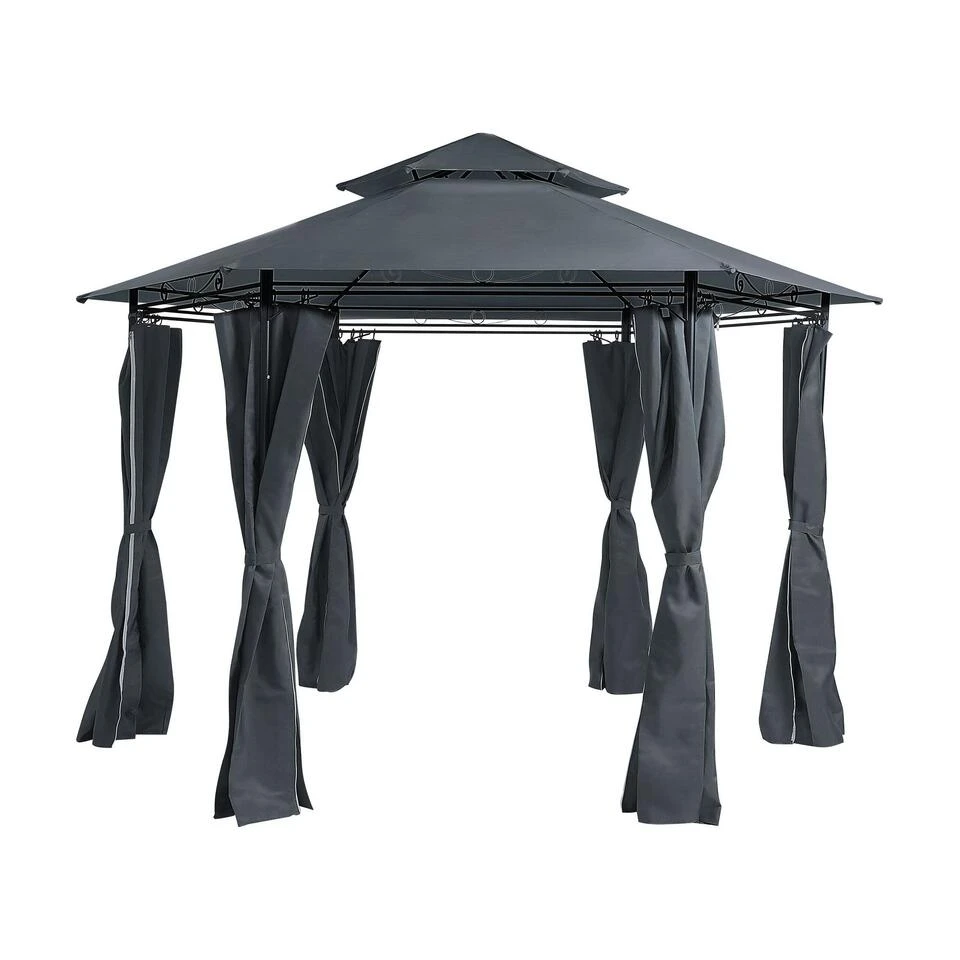 Modern tuinpaviljoen met gordijnen en overkapping. Betrouwbaarheid en flexibiliteit! Afhankelijk van je wensen zijn de stevige polyester gordijnen los te maken van de palen en te verbinden met de praktische ritsen. De hoogwaardige stalen constructie is in elkaar gezet met robuuste haringen. Dit geeft je een knus toevluchtsoord waar jij en je gasten op elk moment van de dag kunnen ontspannen, beschermd tegen wind, regen, zon en nieuwsgierige blikken. De fantasierijke stalen ornamenten onder het UV-bestendige dak maken het schitterende ontwerp van het paviljoen compleet.