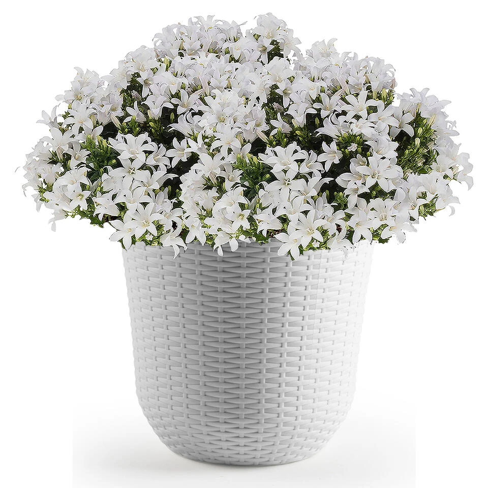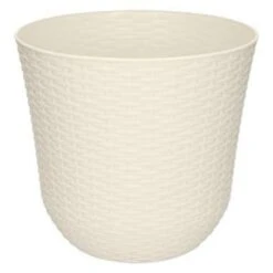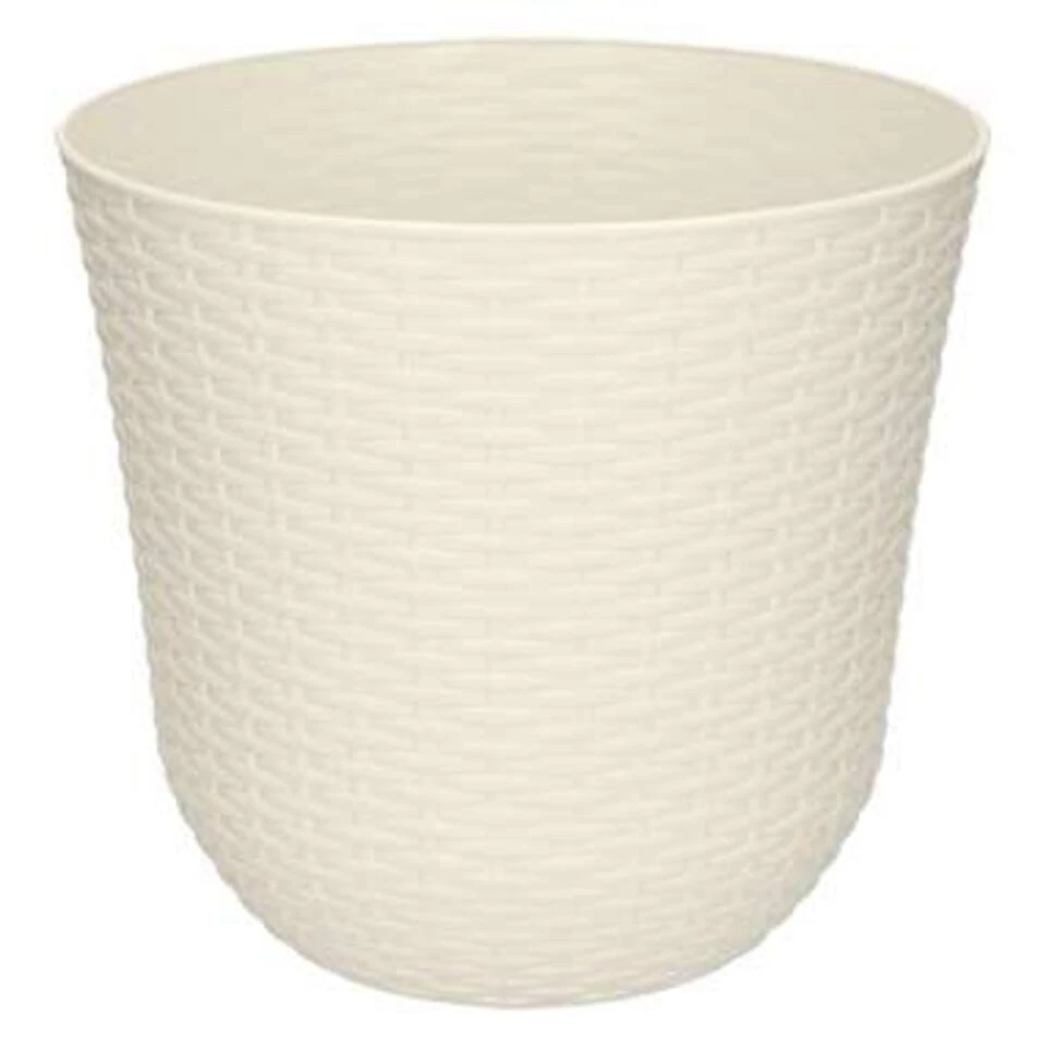 1x Ivoor witte plantenbakken/bloempotten 25 cm. Gevlochten, kunststof plantenbak/bloembak in de kleur ivoor wit. Het formaat van deze ronden bloemen/planten bak is ca. 25 x 25 x 23 cm. Materiaal: kunststof.