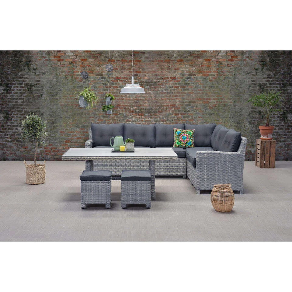 Twijfel je tussen een loungeset of een tuintafel met stoelen? Met de Alaska lounge dining set 6-delig hoef je niet meer te kiezen tussen comfortabel dineren of heerlijk loungen. Deze mooie en ruime lounge dining set van kwaliteitsmerk Garden Impressions heeft het allebei!
