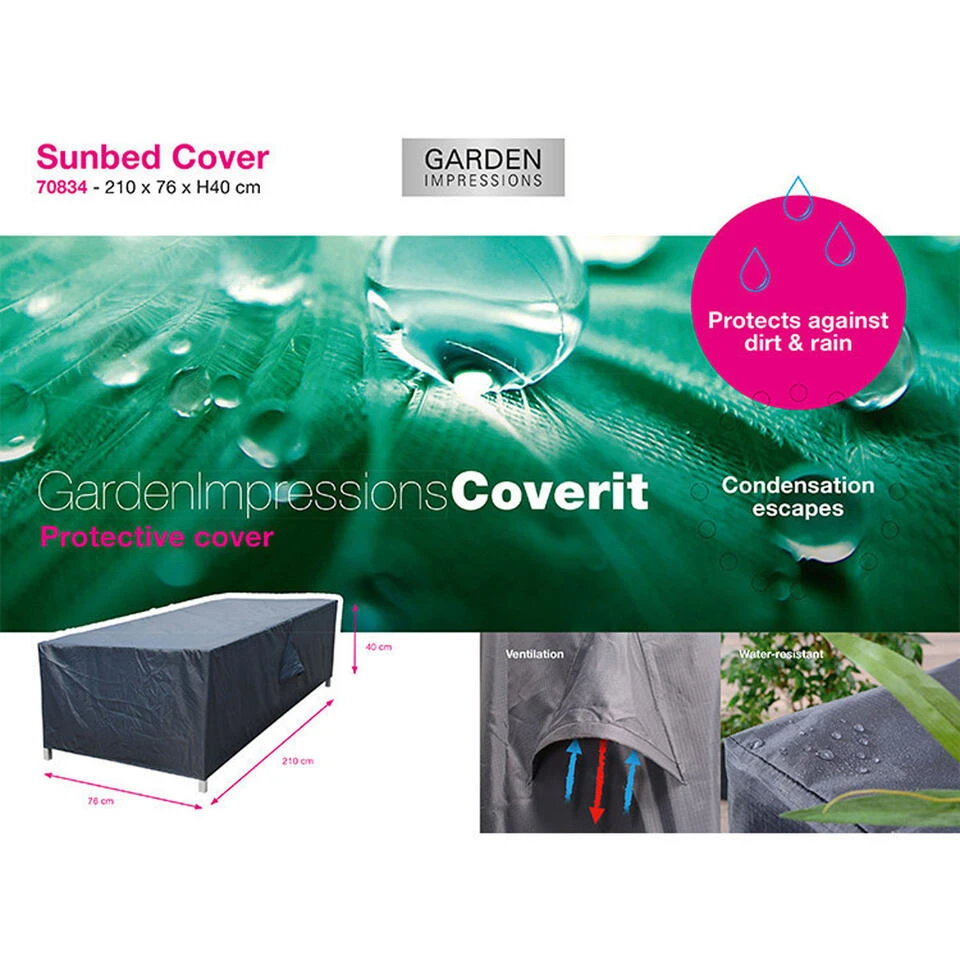 Ben je op zoek naar een beschermhoes voor jouw ligbed? Deze prettige beschermhoes van kwaliteitsmerk Garden Impressions zorgt ervoor dat je langer plezier zal hebben van jouw tuinmeubelen. Om de levensduur van je tuinmeubelen te verlengen, raden wij aan om deze af te dekken in de wintermaanden. De beschermhoezen van Garden Impressions zijn gemaakt van hoogwaardig polyester met een ademende coating. Deze coating zorgt ervoor dat hoes waterbestendig is. De hoes is niet volledig waterdicht, maar waterafstotend. Het is een flexibele ademende coating, waardoor de hoes in de wintermaanden ook nog flexibel blijft. Doordat de hoes niet volledig waterdicht is, is aan te raden om een afstand te creëren tussen het tuinmeubel en de hoes. Het water kan er dan gemakkelijker afstromen en het tuinmeubel kan niet verstikken. De beschermhoes is voorzien van ventilatie driehoeken zodat het tuinmeubel kan ademen. De hoes kan gemakkelijk om de ligbed worden bevestigd. Op alle hoeken zit onderaan een elastieken band om de hoes strak te houden. We raden je aan om de kussen niet onder de hoes te laten liggen. Mocht de kussens al nat zijn geworden, is dat niet erg maar zorg er wel voor dat ze droog worden opgeborgen. De beschermhoes voor ligbed met afmeting 210x76xH40 cm.