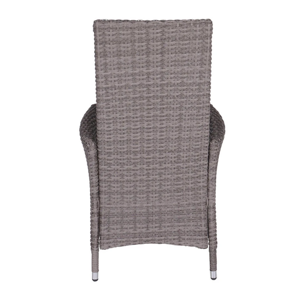De Nice verstelbare tuinstoel van kwaliteitsmerk Garden Impressions is een heerlijke wicker tuinstoel waarin je actief kunt zitten, maar ook heerlijk achterover kunt liggen. Heb je de behoefte om de rugleuning een klein beetje of bijna helemaal plat naar achteren te doen, dan kan dat! De Nice verstelbare tuinstoel is vervaardigd uit een onderhoudsvrij aluminium frame. Daaromheen is, met de hand, weerbestendig 2-half wicker vlechtwerkdraad in de kleur organic grey gevlochten. Het wicker is gemaakt van een stevige kunststof waardoor de set zeer duurzaam is. Deze stoel wordt compleet geleverd met een polyester zitkussen van hoogwaardige kwaliteit. Het zitkussen is bovendien voorzien van een rits, waardoor het hoesje met de hand gewassen kan worden. Het kussen is niet 100% waterdicht, maar is wel voorzien van een waterafstotende coating. Dit is vooral erg praktisch als er bijvoorbeeld op het kussen wordt gemorst met drinken. Je veegt het vocht er namelijk gemakkelijk weer af. Na gebruik kan het kussen opgeborgen worden in de schuur of in een mooie kussenbox. De rugleuning van deze stoel kan gemakkelijk door middel van de gasveer in iedere gewenste stand naar achteren geplaatst worden. Hierdoor kun je heerlijk dineren in de stoel, maar ook achterover liggend genieten van de zon. Deze verstelbare wicker tuinstoel is voorzien van een gasveer van een hoogwaardige kwaliteit. Voor behoud van de gasveer is er gebruik gemaakt van een koker met kunststof sluitingsranden om de gasveer. Dit voorkomt dat er zomaar vocht bij de gasveer kan komen. Uiteraard kan door de jaren heen er wel wat vocht bij komen. Om dit zoveel mogelijk te beperking wordt er aangeraden om de stoelen bij nat of vochtig weer af te dekken met een passende beschermhoes. De afmetingen van deze stoel zijn: B 62 x D 59 x H 110 cm.