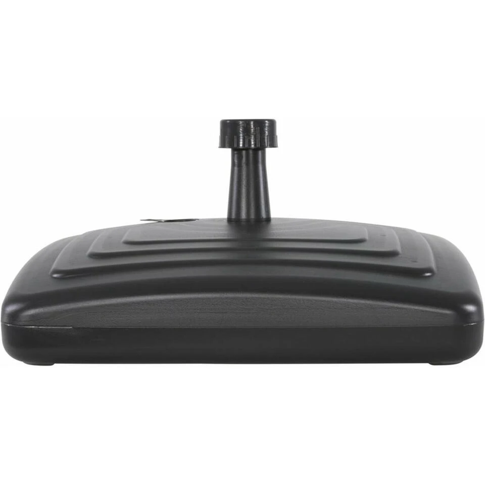 Parasolvoet speciaal voor het balkon. Afmeting (lxbxh): 56 x 40 x 13 cm. Materiaal: kunststof. Inhoud: 20 liter. De standaard is geschikt voor het balkon, doordat de standaard geheel aan de zijkant van de voet geplaatst is. Deze parasol standaard kan gevuld worden met water of zand zodat deze blijft staan. Geschikt voor stokken met een afmeting tussen 20-38mm doorsnee.