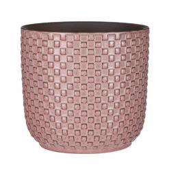 Plantenpot/bloempot van keramiek in de kleur roze met een mooi patroon. Diameter 17 cm en hoogte 16 cm. Stijlvolle bloempotten voor binnen gebruik met een glanzende finish. Serie: Daan. Het vierkantjes patroon aan de buitenzijde van de pot geeft het geheel een modieus fraai stijlvol uiterlijk. Handgemaakt keramiek.