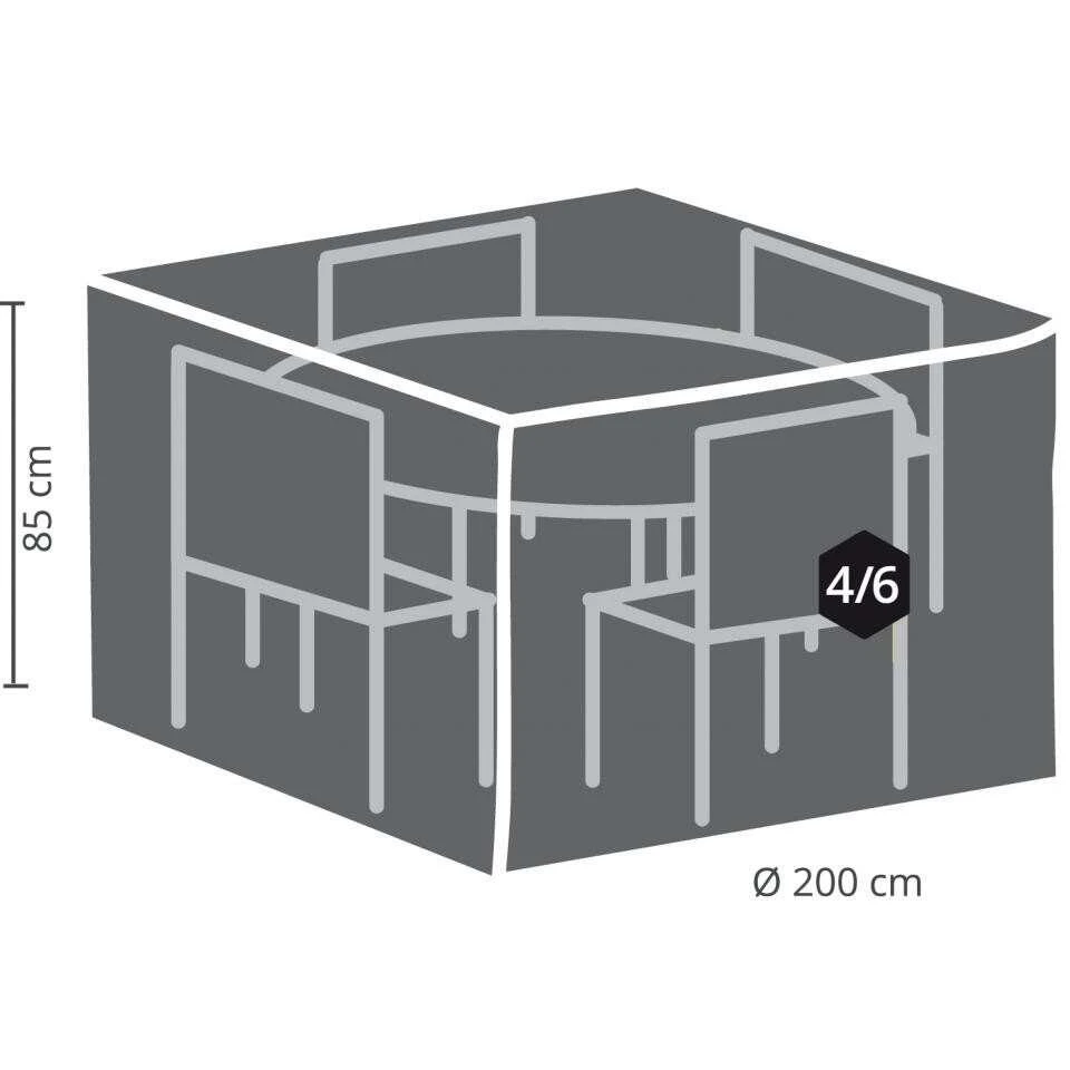 Deze Outdoor Covers hoes van 200 cm is geschikt voor een dining set met een ronde tafel van maximaal Ø150 cm, met 4 tot 6 stoelen.