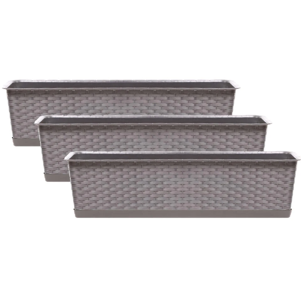 Kunststof Ratolla rotan plantenbak/bloembak/balkonbak set taupe 8 liter met bijpassende opvangschotel/opvangbak. Kras en stootvaste bloembak/plantenbak met rotan vlechtwerk uitstraling. Zonder afwateringsgaten, deze kunt u naar wens zelf maken. De bloembakken/plantenbakken zijn geschikt voor binnen en buiten gebruik. Serie: ratolla case. Formaat: lengte ca 50 cm. Breedte: ca 17,3 cm. Hoogte: ca 14,5 cm. Inhoud: 8 liter.